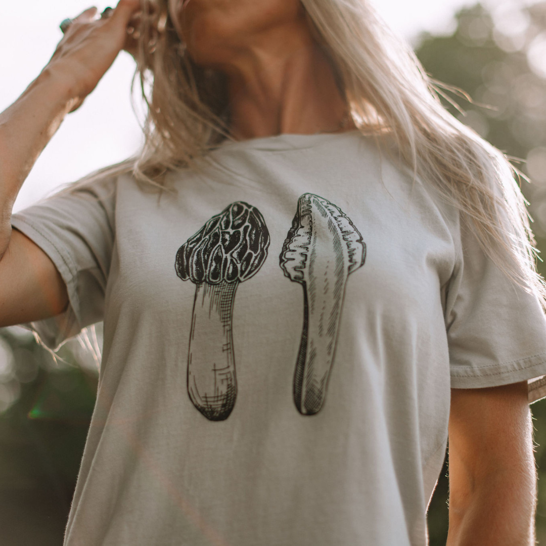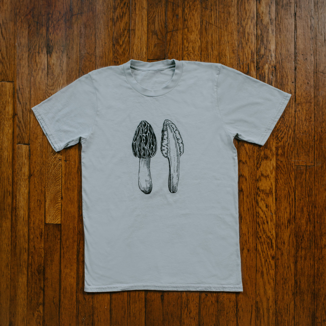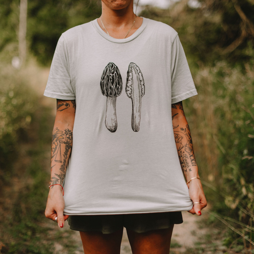 Our 100% organic cotton Morel Tee is perfect for nature enthusiasts and mushroom foragers alike. These shirts feature a beautifully detailed illustration of the beloved morel mushroom, a true gem of the forest.