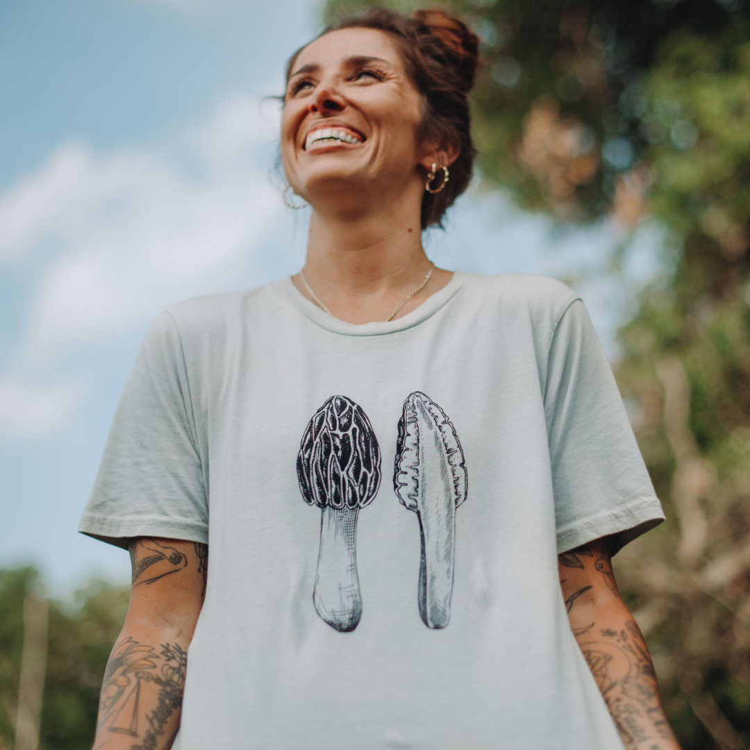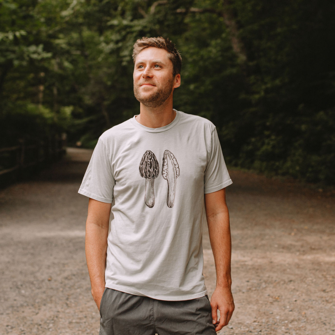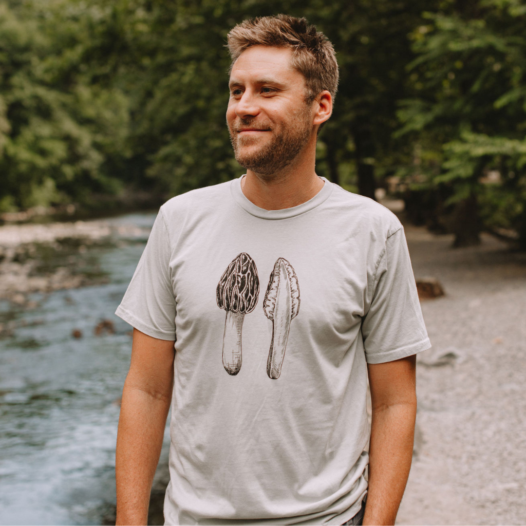 Our 100% organic cotton Morel Tee is perfect for nature enthusiasts and mushroom foragers alike. These shirts feature a beautifully detailed illustration of the beloved morel mushroom, a true gem of the forest.